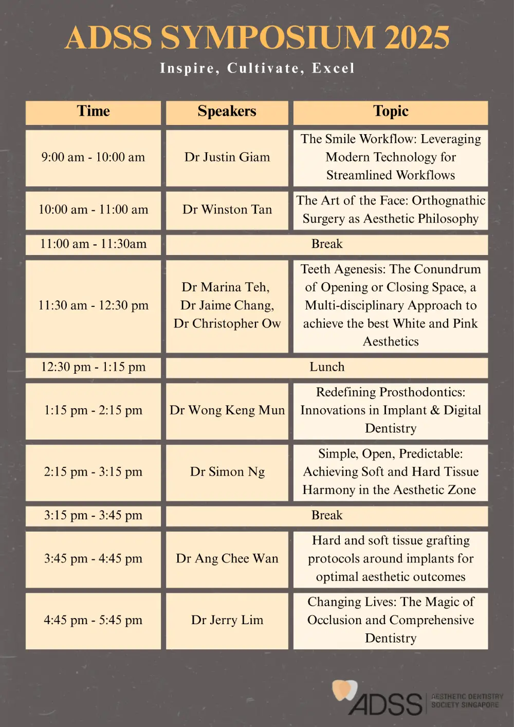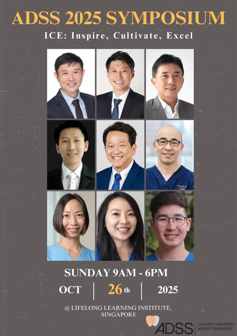 Registration will be valid upon full payment. Organisers reserve the rights to amend any part of the programme without giving prior notice and to cancel or postpone, change the venue, date and/or time of the event. Cancellation of registration must be made in writing or email to Aesthetic Dentistry Society Singapore. Cancellation received before 25th Oct 2025 will be granted a 50% refund. There will be no refunds for cancellations from 25th Oct 2025 onwards or for non-attendance.